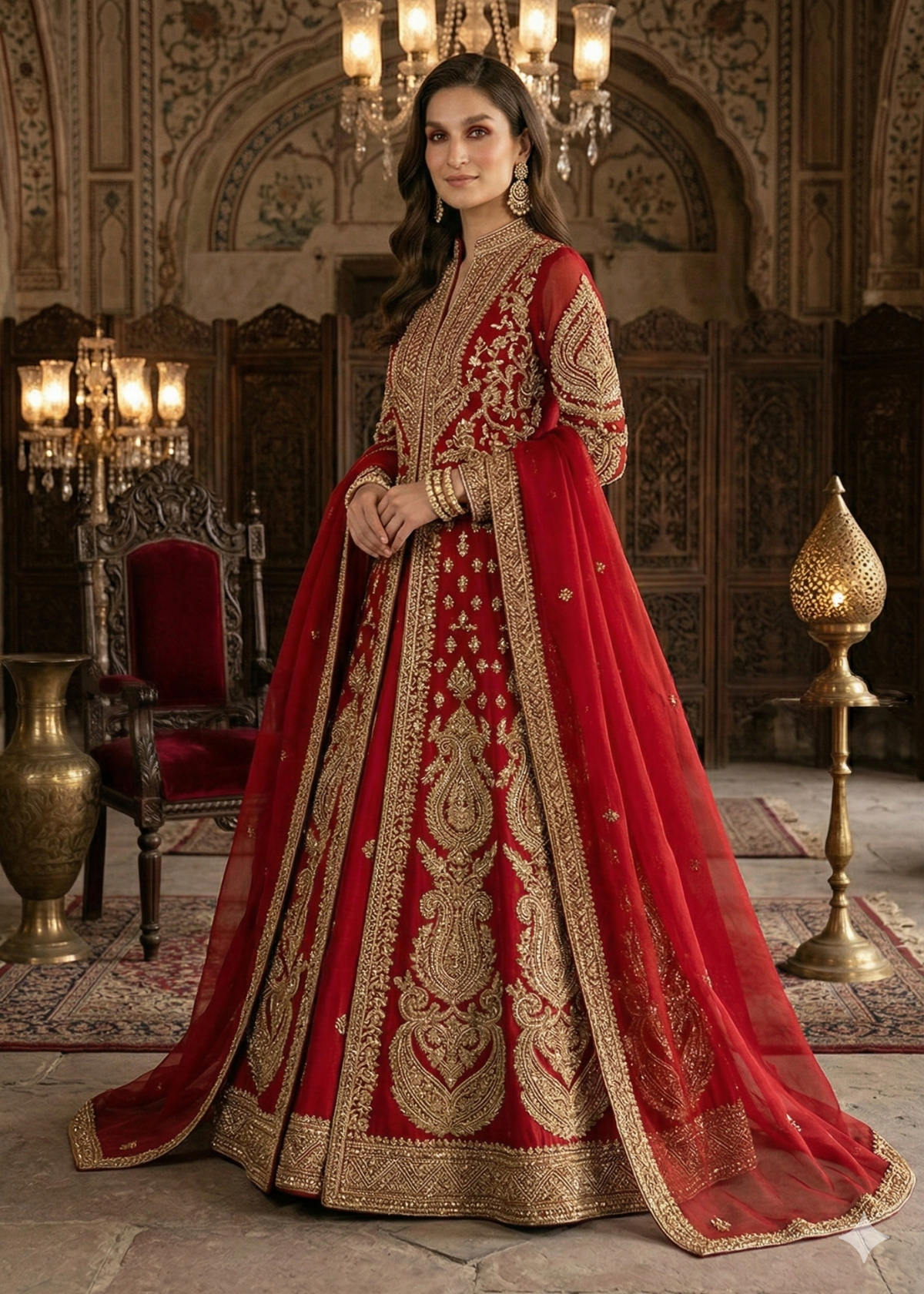 This breathtaking ivory bridal lehenga is a masterpiece of traditional craftsmanship and regal opulence. The ensemble features a meticulously hand-embellished blouse paired with a voluminous lehenga, both adorned with intricate gold zardozi, tilla work, and delicate floral motifs. The fluid, flowy silhouette is designed to create a majestic presence, while the sheer embroidered dupatta with heavy borders adds a layer of ethereal grace. A perfect fusion of heritage artistry and a timeless aesthetic, this bridal outfit is the ultimate choice for a grand wedding ceremony.