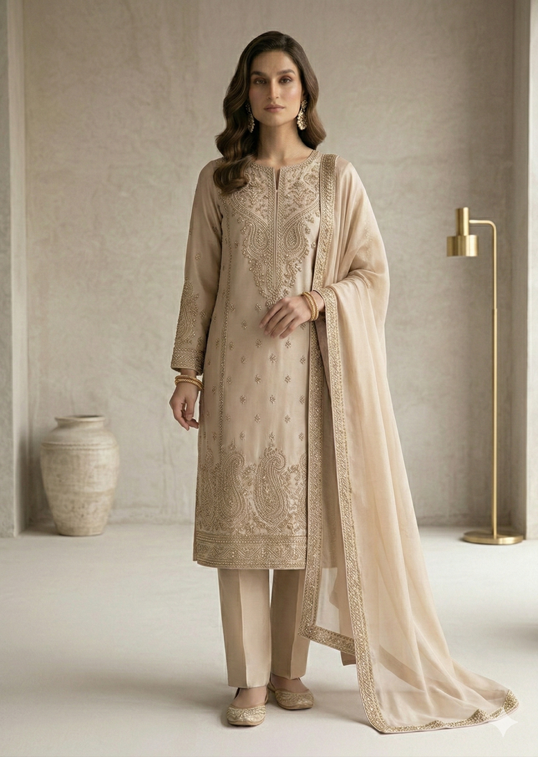 This breathtaking ivory bridal lehenga is a masterpiece of traditional craftsmanship and regal opulence. The ensemble features a meticulously hand-embellished blouse paired with a voluminous lehenga, both adorned with intricate gold zardozi, tilla work, and delicate floral motifs. The fluid, flowy silhouette is designed to create a majestic presence, while the sheer embroidered dupatta with heavy borders adds a layer of ethereal grace. A perfect fusion of heritage artistry and a timeless aesthetic, this bridal outfit is the ultimate choice for a grand wedding ceremony.